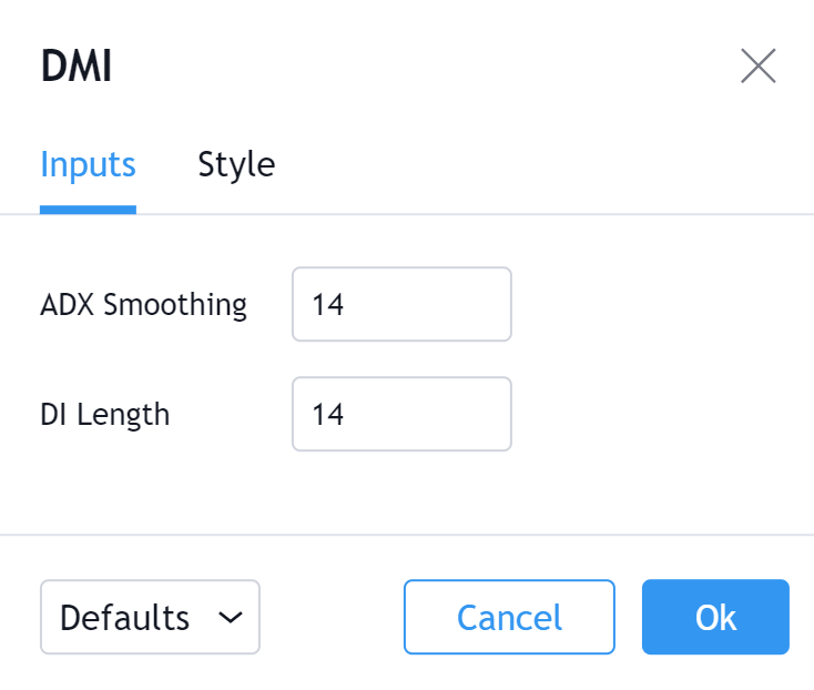 ADXの値を表示するラインの可視性を切り換える事ができます。ADXラインの色や太さ、ビジュアルスタイル(デフォルトはライン)を選択する事も可能です。