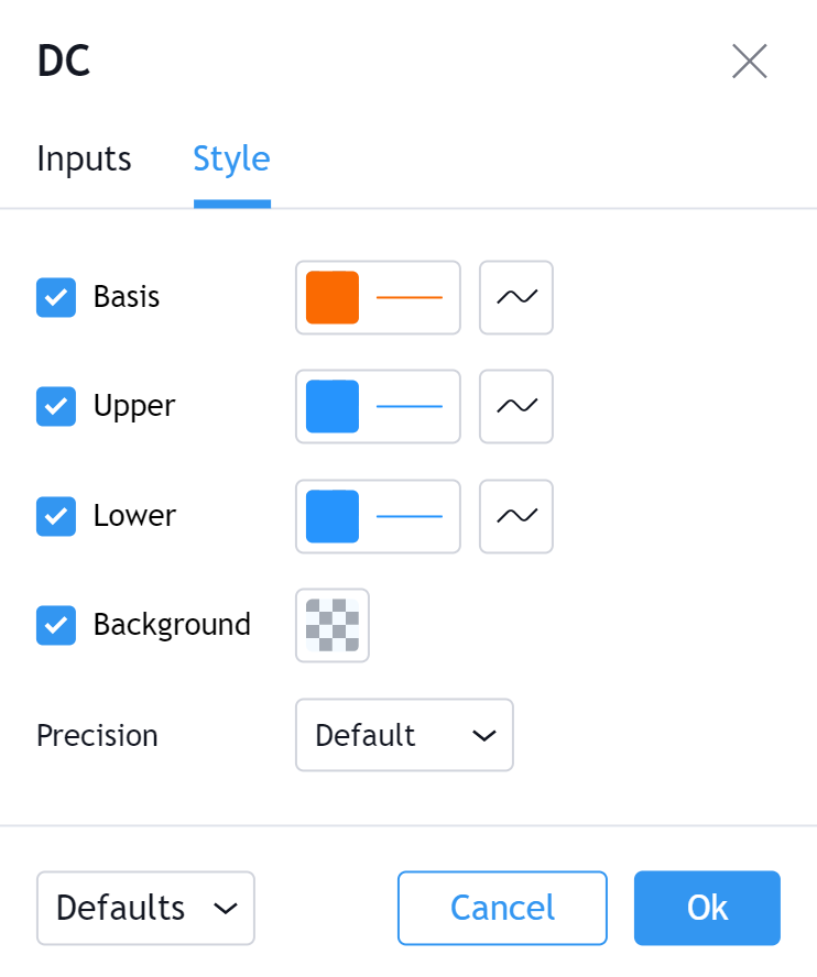 ロワーバンドの値を表示するラインの可視性を切り換える事ができます。ロワーバンドの色や太さ、ラインの種類を選択する事も可能です。