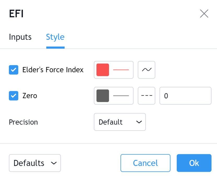 EFIの値を表示するラインの可視性を切り換える事ができます。EFIのラインの色や太さ、ビジュアルタイプ(デフォルトはラインです)を選択する事も可能です。
