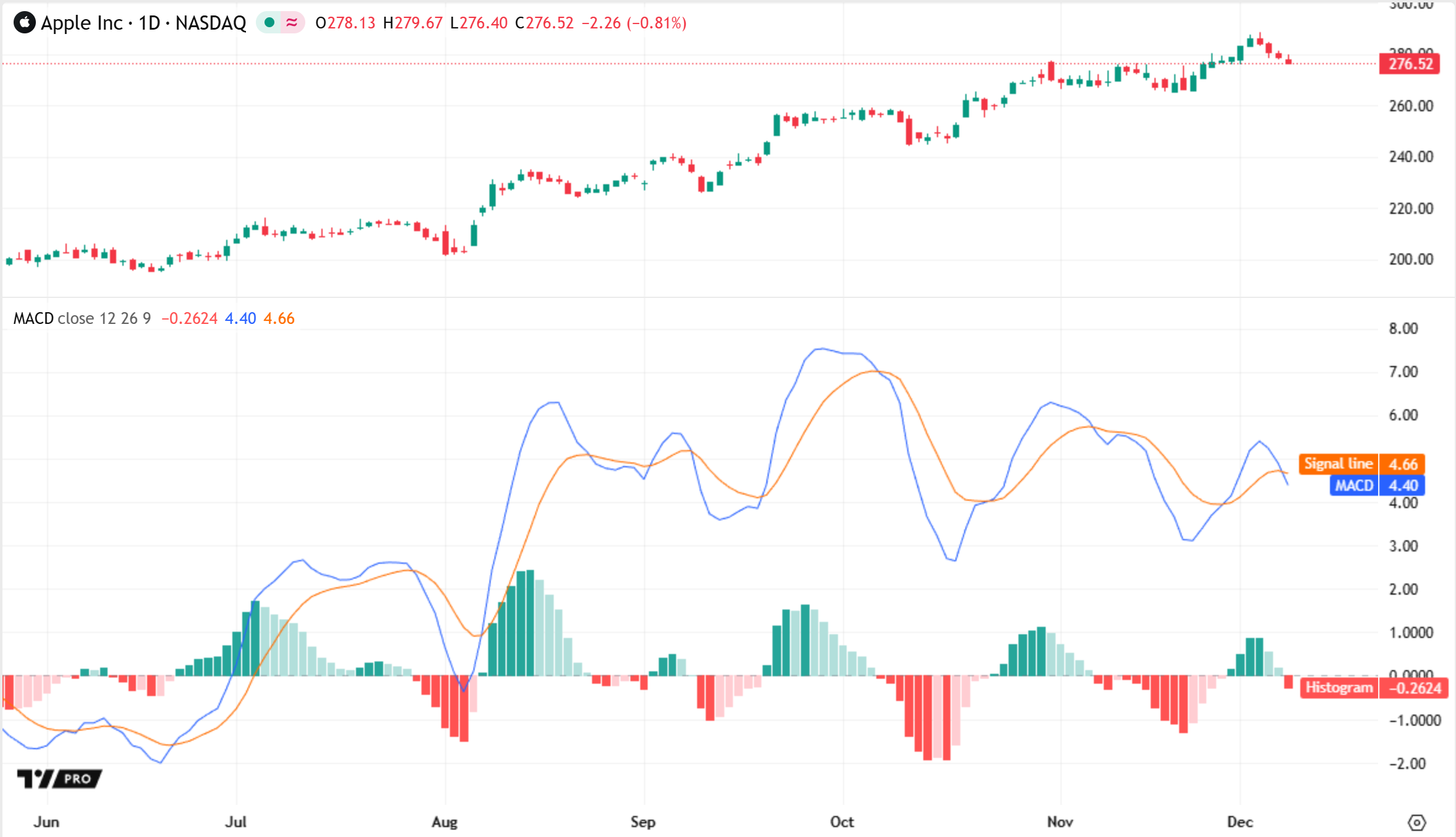 - ヒストグラムがゼロを下回る、またはMACDラインがシグナルを下回った場合、下降の勢いが増している、あるいは上昇の勢いが減少していることを示唆します