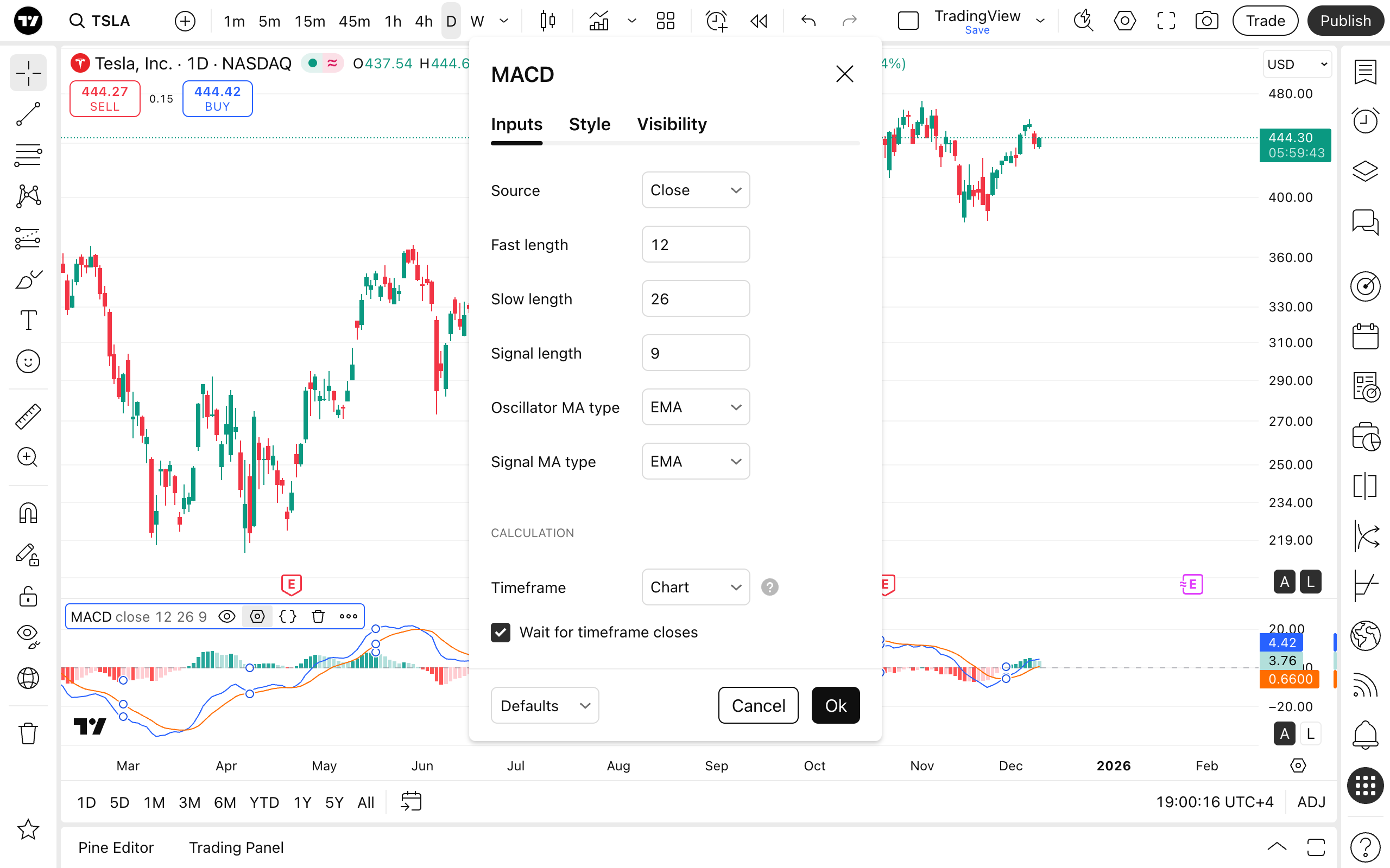 当社のMACDは、これら3つ(MACDライン、シグナルライン、ヒストグラム)がすべて、メインチャートとは別のペインに表示されます。
