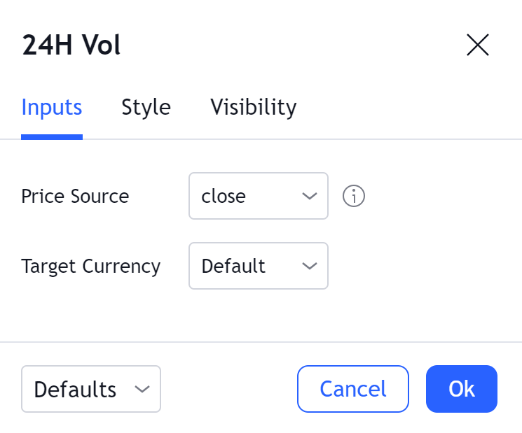 このインジケーターでは、常にパラメーターで指定した通貨に変換された24時間出来高が表示されます。つまり、取引所がベース通貨で出来高データを提供している場合 (例: BTCUSDの場合、出来高はBTCでの取引数量を示します)、24時間出来高は、この出来高にチャート上の価格を乗算することにより、通常の出来高を通貨建て出来高に変換します。パラメーター 'Price Source' で、変換する時にチャート上のどの価格ソースを使用するのかを指定できます。