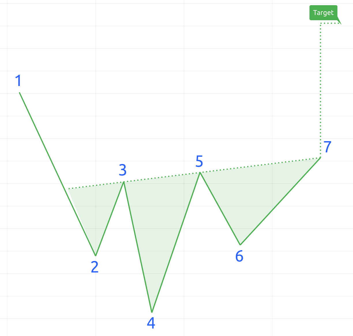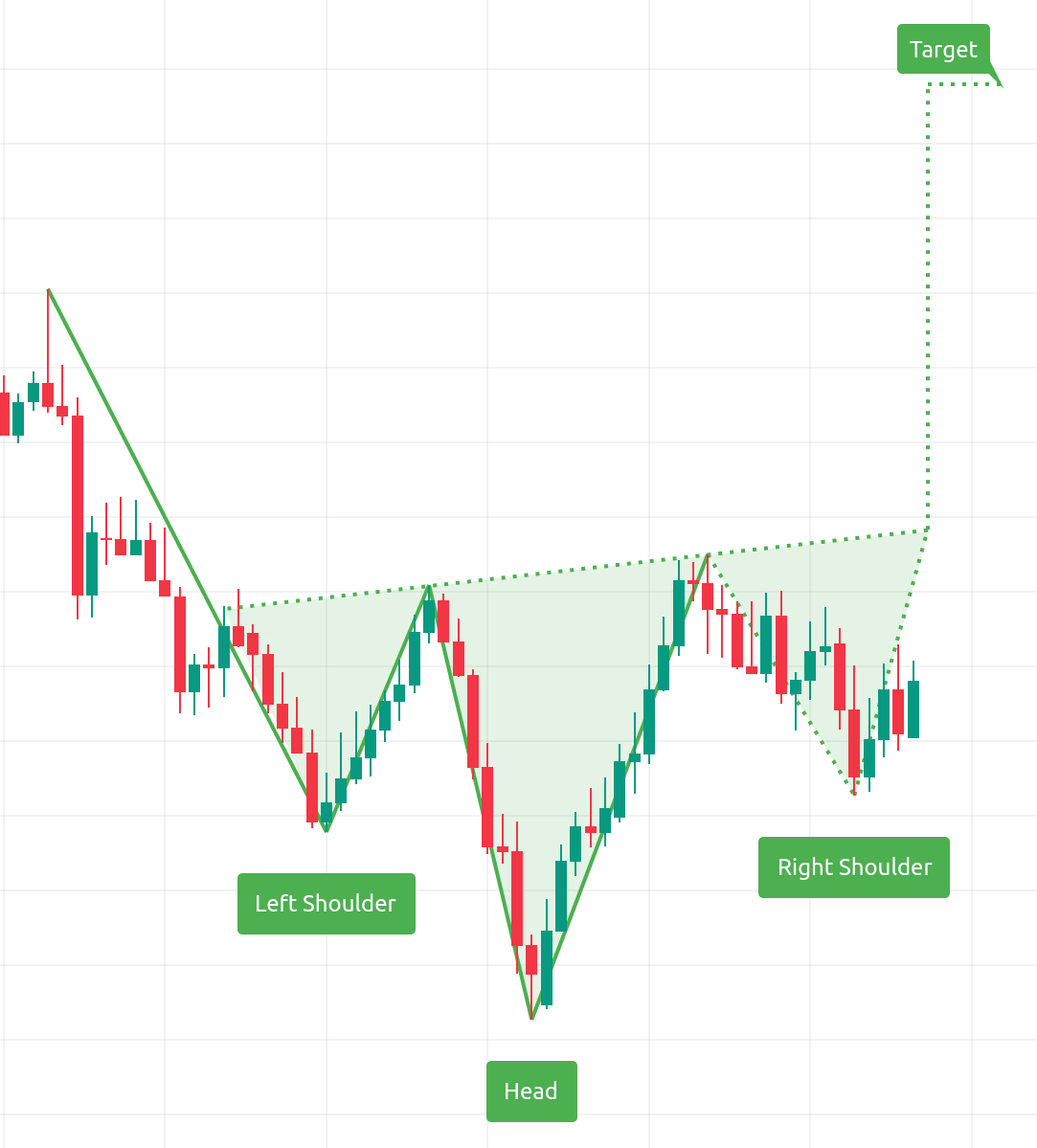 逆ヘッドアンドショルダーは、3つの連続した安値とその中間にある2つの高値で形成される反転パターンです。最初と3番目の安値は肩(ショルダー)と呼ばれています。これらは頭(ヘッド)となる2番目の安値よりも上方にあり、どちらもほぼ同じ水準に位置しています。また中間の高値に沿って引かれるネックラインも重要です。このパターンは、価格が右肩に到達し、その後ネックラインを上回った時にはじめて完成したとみなされます。パターンが完成すると、ヘッドからネックラインまでとほぼ同じ値幅分さらに価格が上昇すると予想されます。