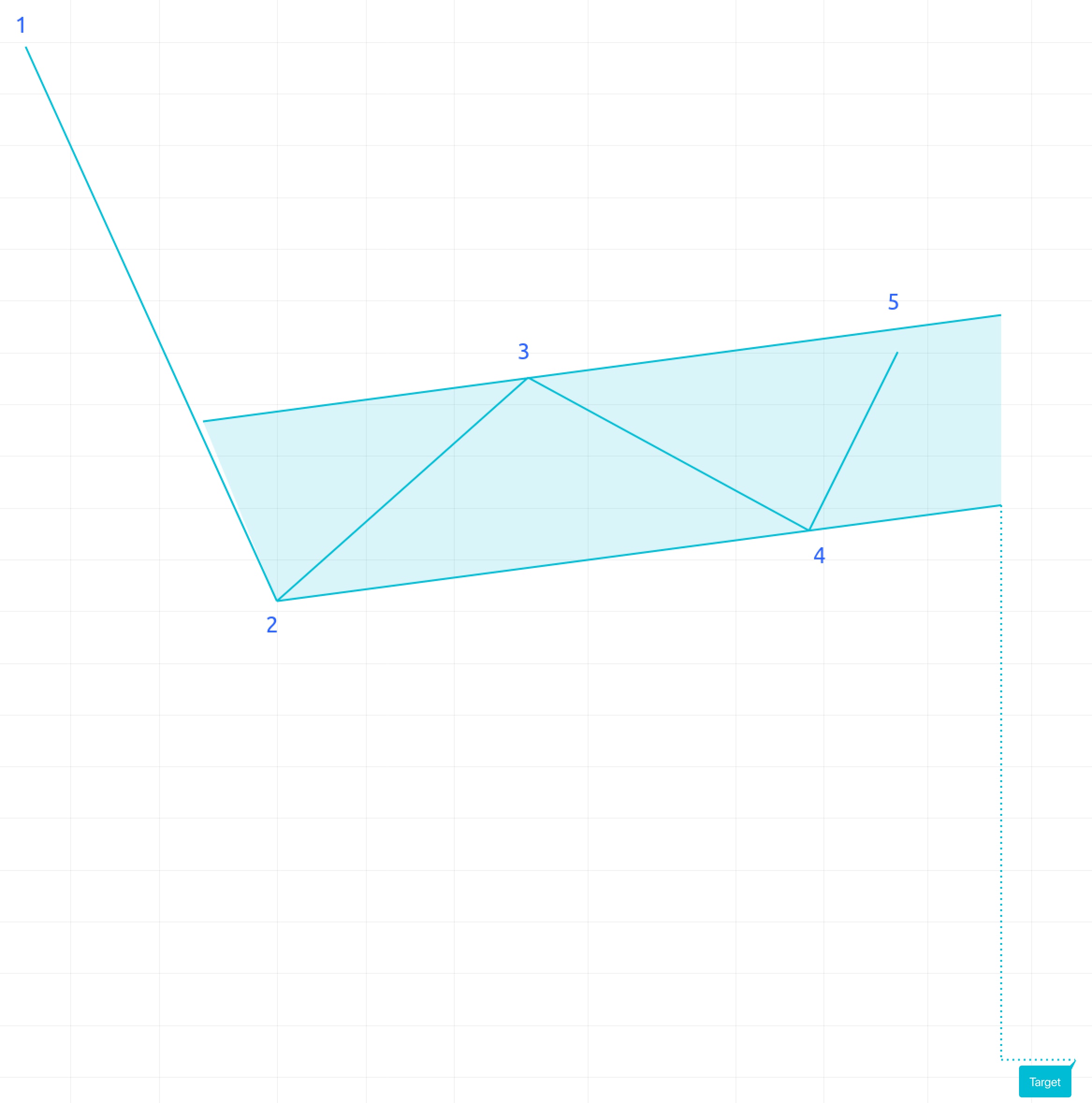 Targetのラベルが付けられた点線の水平線が表示されますが、これはパターン形成後に到達すると予想される価格水準を示しています。新しいバーが出現すると、この線は右方向へ直近のバーまで延長され、パターンの状態がAwatingから変化するまで続きます。ラベルのツールチップには、価格とパターンの現在のステータスが表示されます。ステータスが変わると、ラベルの色も変化します。全部で以下4つのステータスがあります: