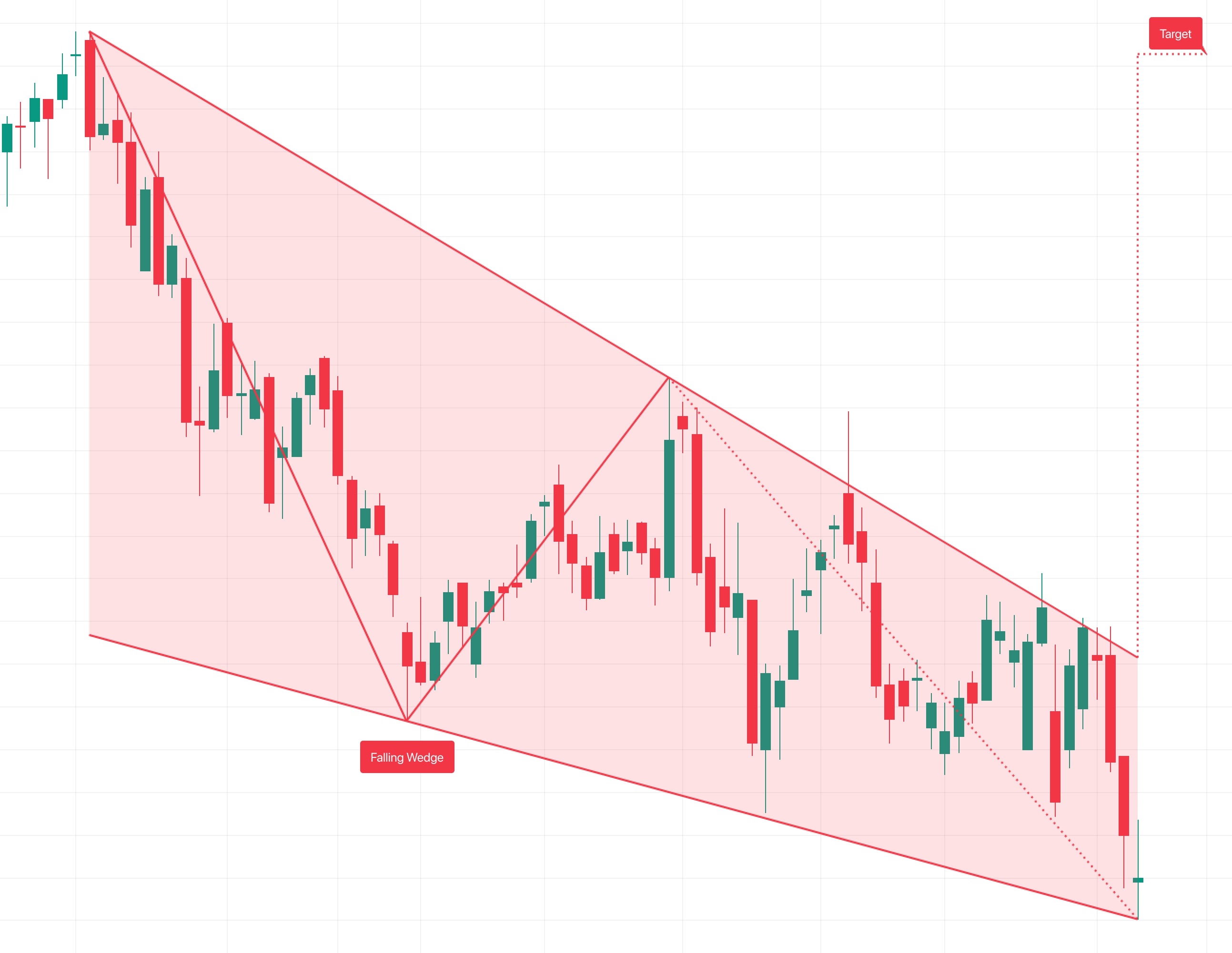- Awaiting 価格がウェッジをブレイクしていないか、ブレイクしたとしても、価格がウェッジ下方のラインの最下点を下回っておらず、ターゲットにも到達していない。