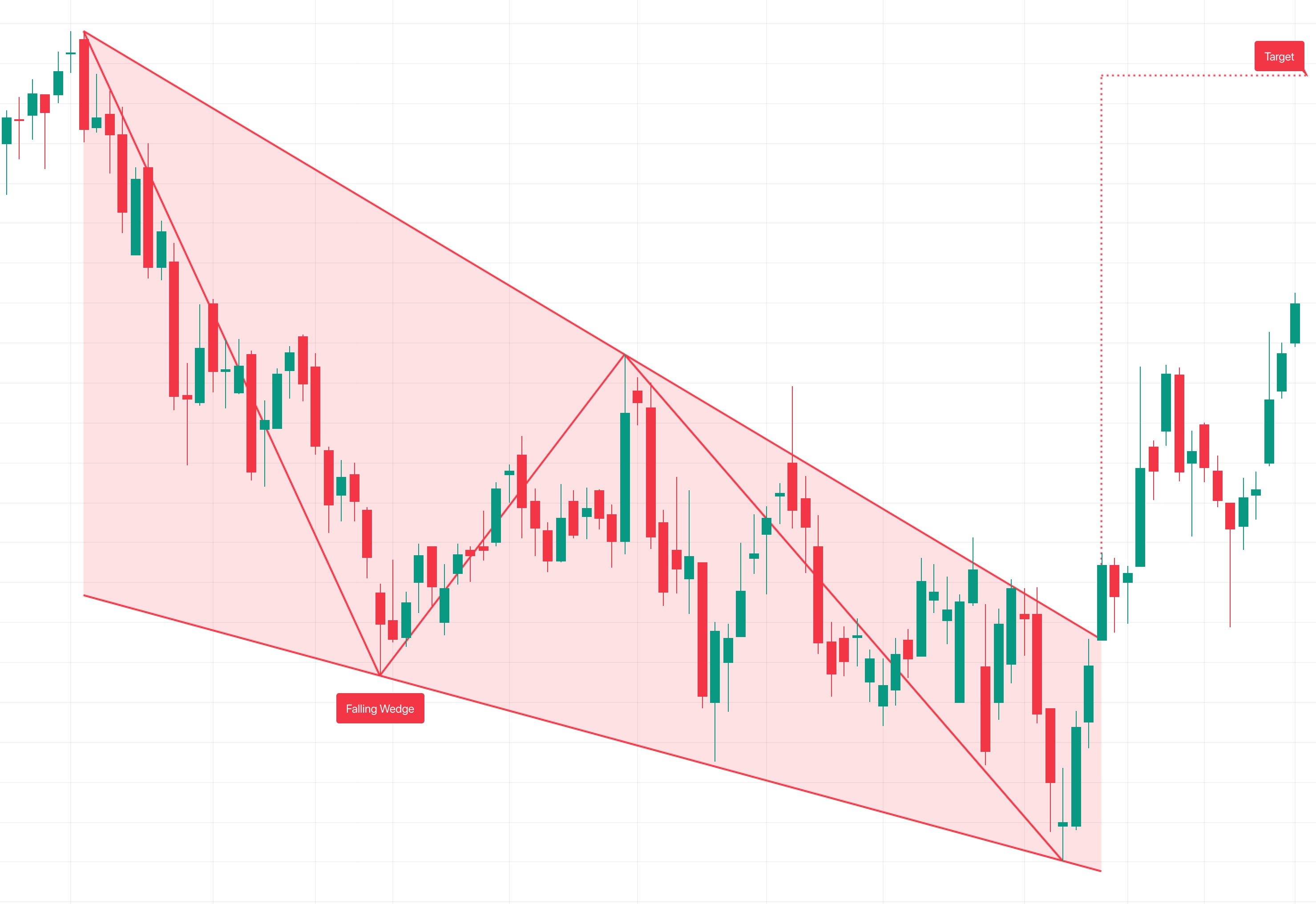 下降ウェッジとは、傾斜しながら収束していくチャネル内で価格が動く反転パターンのことです。チャネルラインは下向きになっています。ウェッジ上方のラインを上抜けた後、ウェッジの最初の高さとほぼ同じ値幅分まで、さらに価格が上昇することが予想されます。