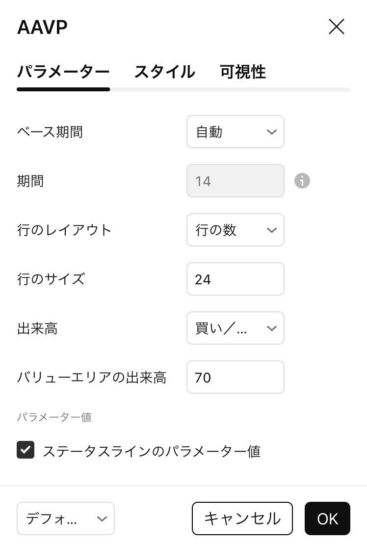 アンカーを検索する際に分析対象となるバーの本数を指定する項目です。「ベース期間」を最高値、最安値、最高出来高に設定した場合にのみ適用されます。例: 「ベース期間」を最高値、「期間」を100に設定すると、インジケーターは過去100本のバーの中から最高値を記録したバーを検索して、そこから出来高プロファイルの計算を開始します。