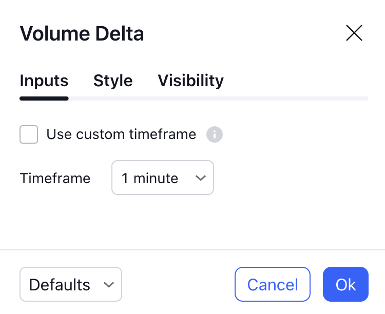「出来高デルタ」は、各チャートバー内の下位時間足の出来高と値動きをスキャンして、出来高デルタ値を計算します。これを行うには、まず分析するバー内の時間足を決定する必要があります。