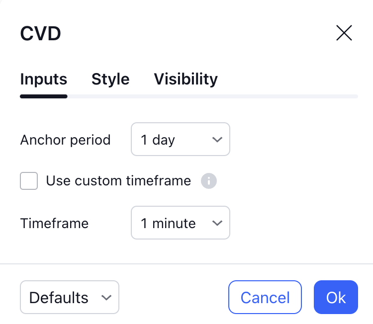 計算期間の長さを指定します。期間が新しく改まると、そのたびに出来高デルタ値の累積がリセットされ、CVDのローソク足は0からスタートします。期間中は、各バーの出来高デルタ値が期間を通じた合計に加算されるため、現在のCVDのローソク足の始値は前のローソク足の終値に等しくなります。
