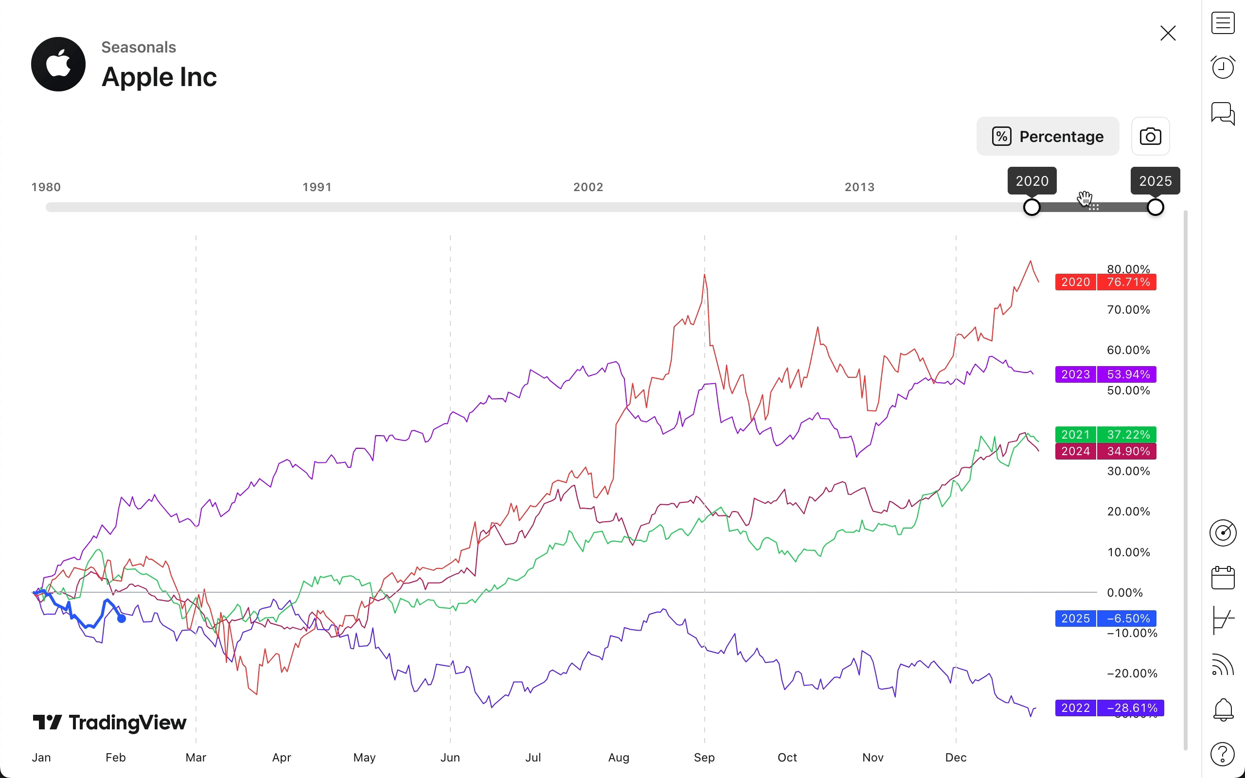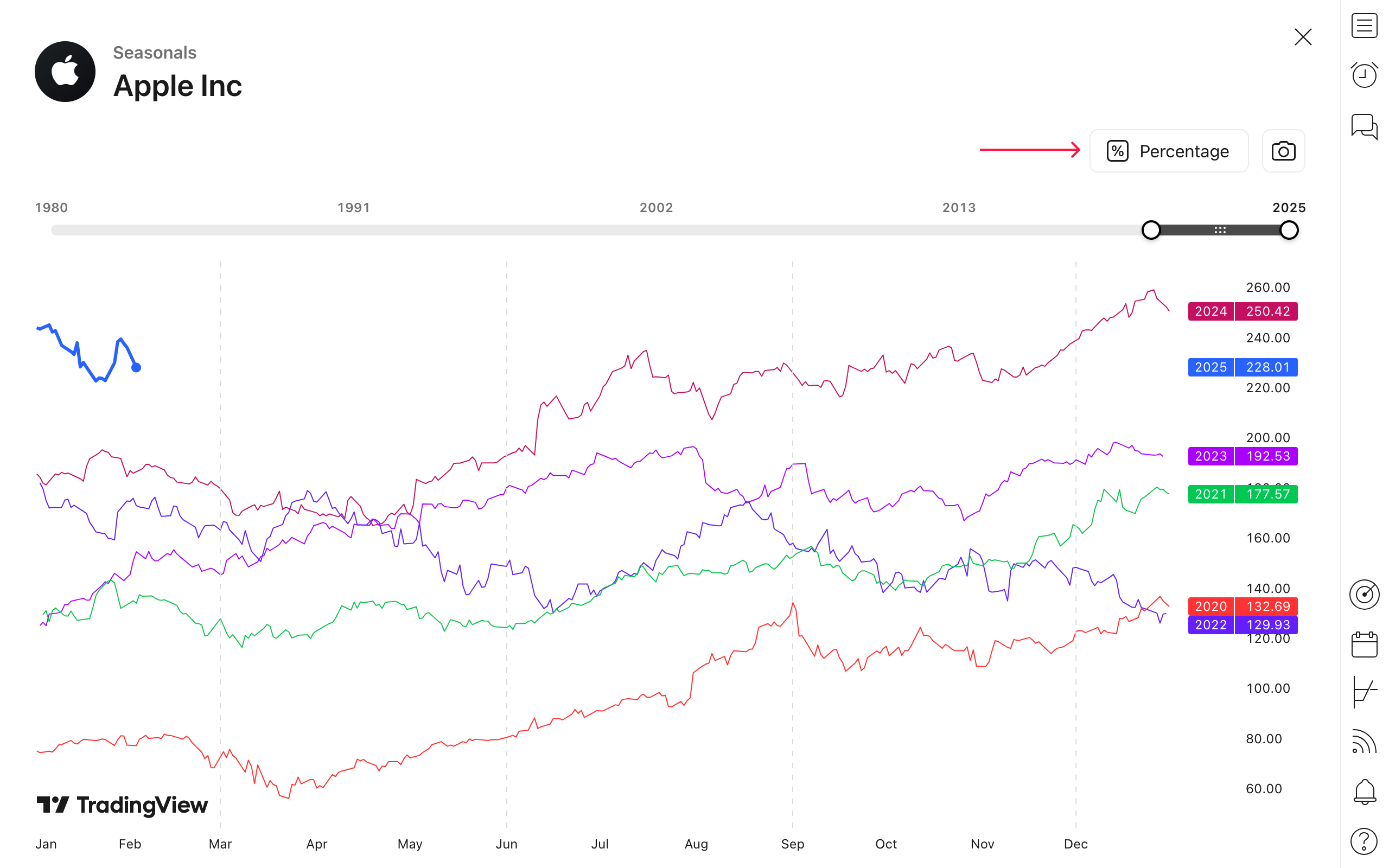 価格スケールのモードを変更するには「パーセンテージ」ボタンをクリックします。このボタンが有効であれば、価格変動は年初からの変動率で表示されます。ボタンが有効でなければ、パーセンテージモードは無効になり、価格変動は絶対値で表示されます。