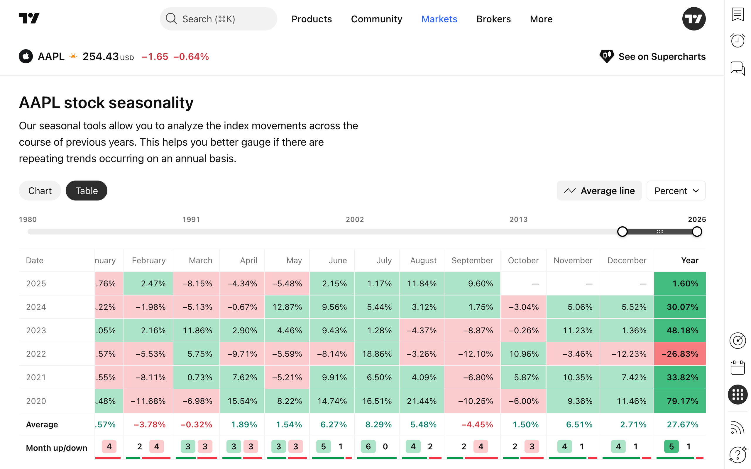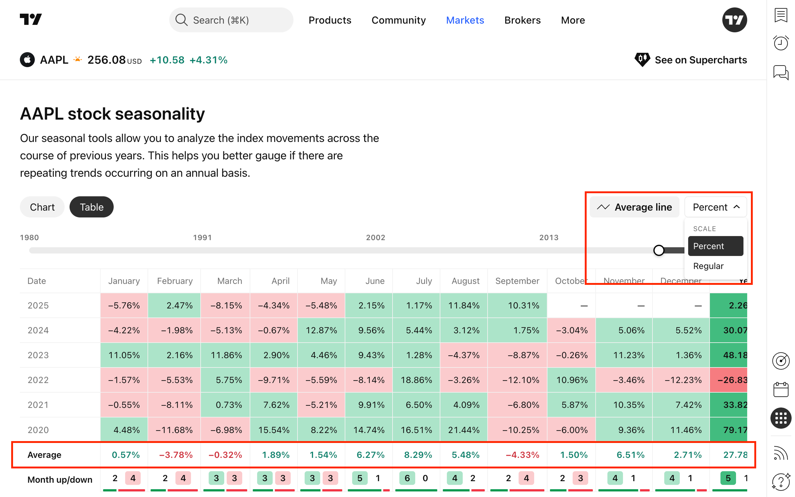 また、季節性を表形式で表示することもできます。表の各行は暦年、各セルはその月の価格変動を示します。セルが色分けされているので一目でトレンドを把握できます。プラスの変動は緑色、マイナスの変動は赤色で示されます。表の下部には各年のプラス月とマイナス月の分布を示すサマリー行もあります。