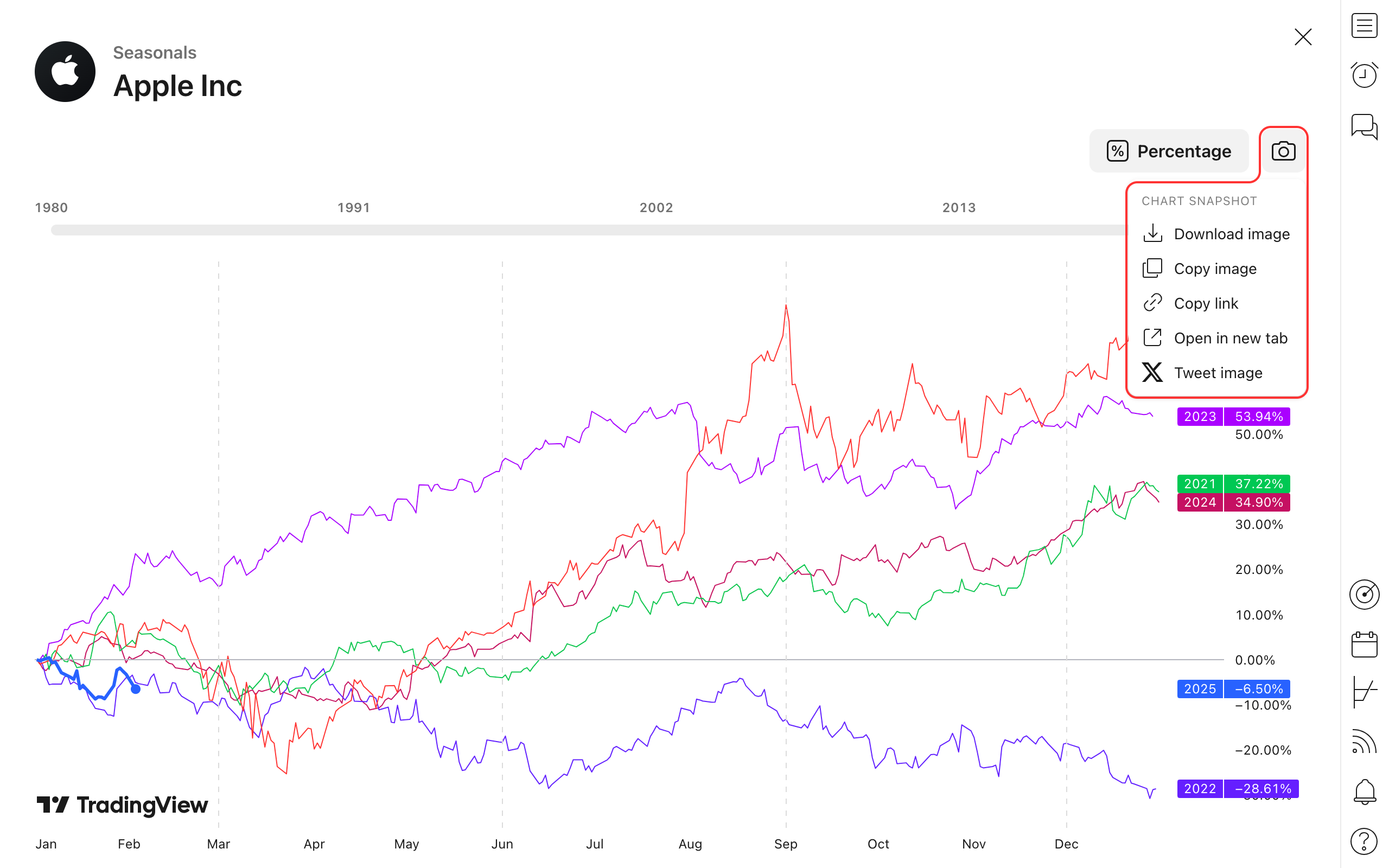 分析が完了したら、そのチャート画像を保存したり、スナップショットを共有することができます。カメラのアイコンをクリックして、目的に適うオプションを選択してください。
