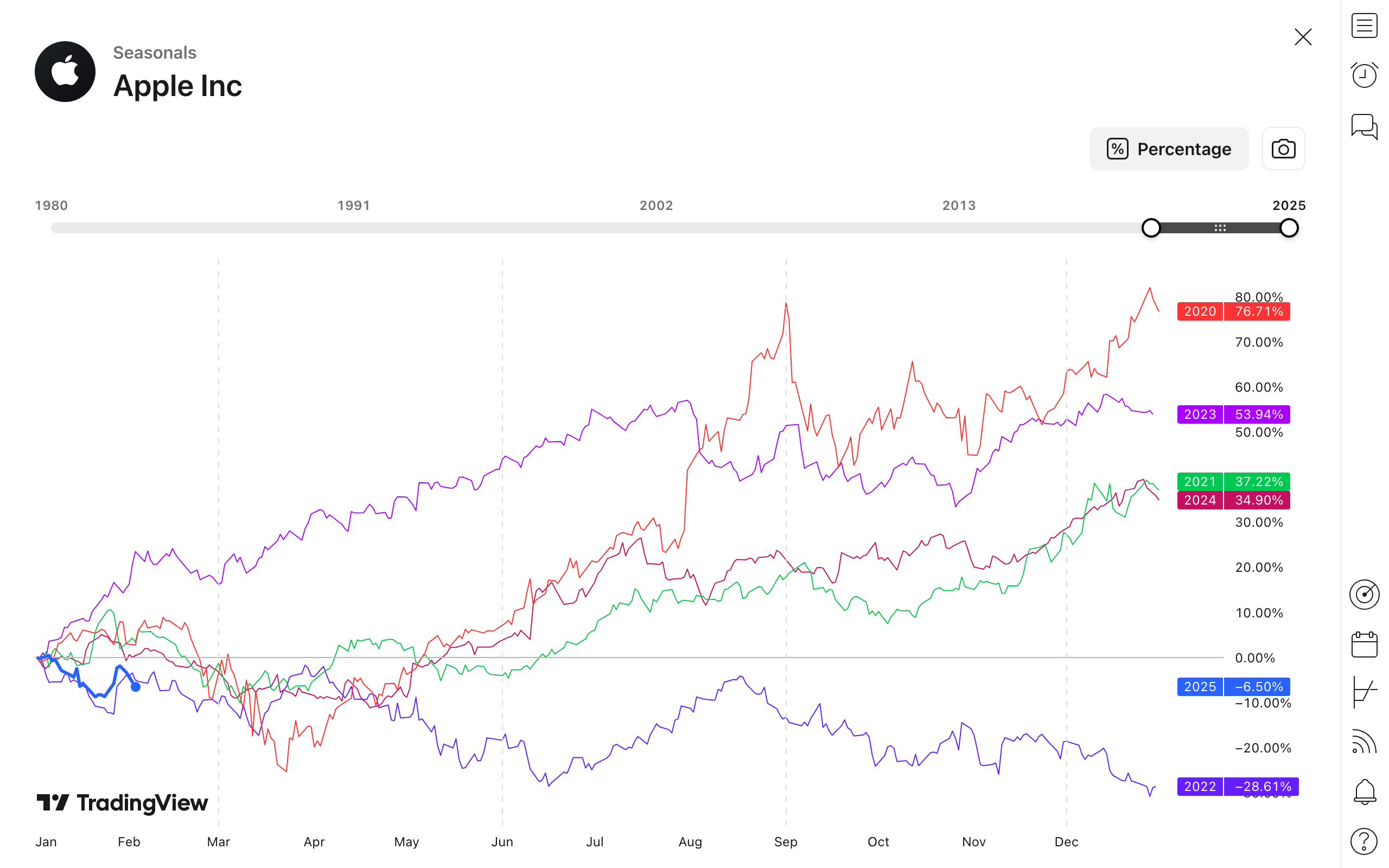 これらのチャートは参照専用で変更はできません。チャートをカスタマイズできるスタンドアロンの「季節性」ページを開くには、ウィジェットの「季節性の詳細」ボタンをクリックするか、シンボルページの「季節性」タブを開いてください。