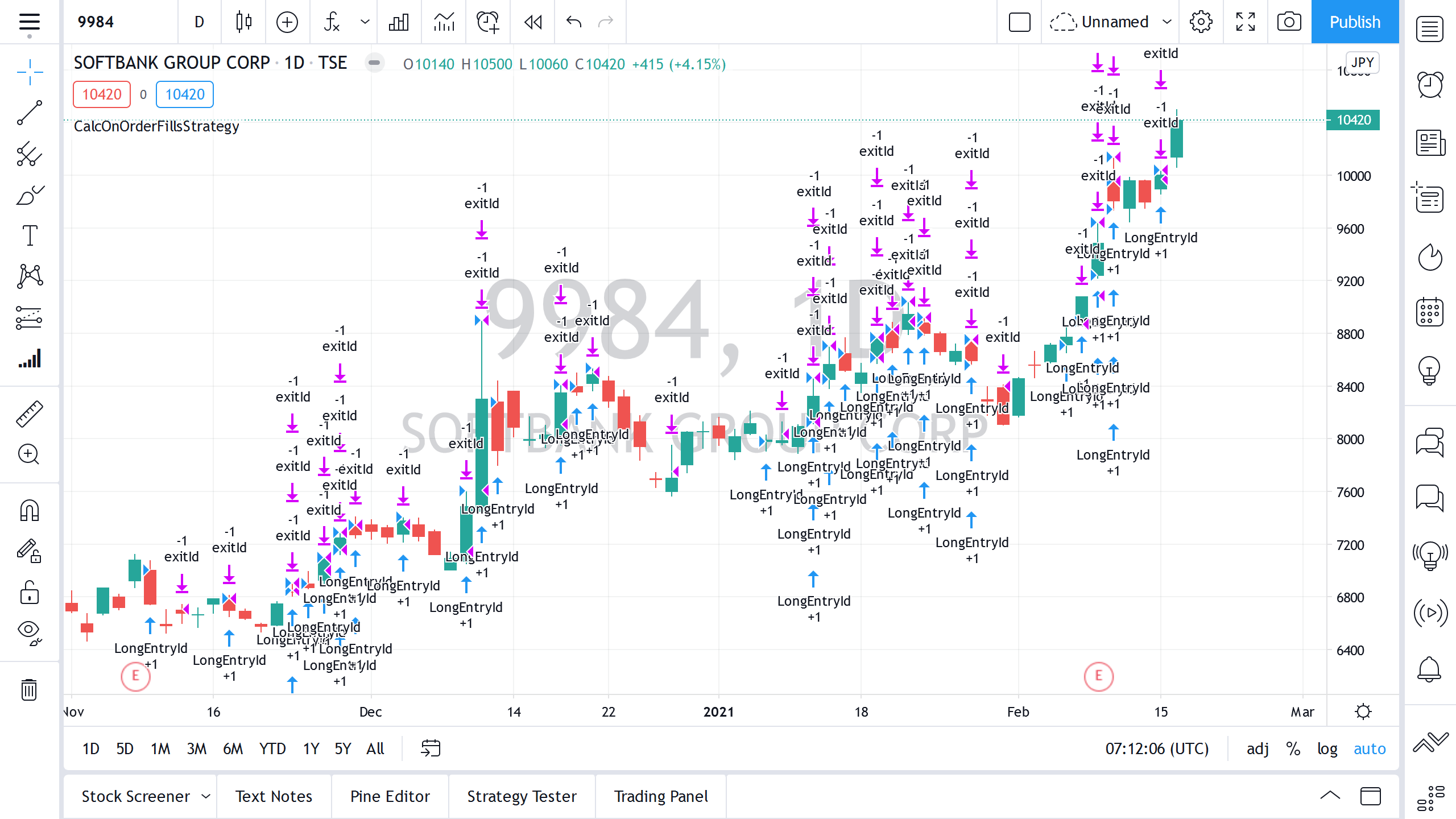 スクリーンショットを見ると、エントリーはバーの始値で、エグジットは同じバーの高値で行われている事が確認できます。つまり計算では、注文が約定された後、strategy.exit の指値価格を現在のバーの高値と同じに設定していますが、これは実際の取引では行う事ができません。