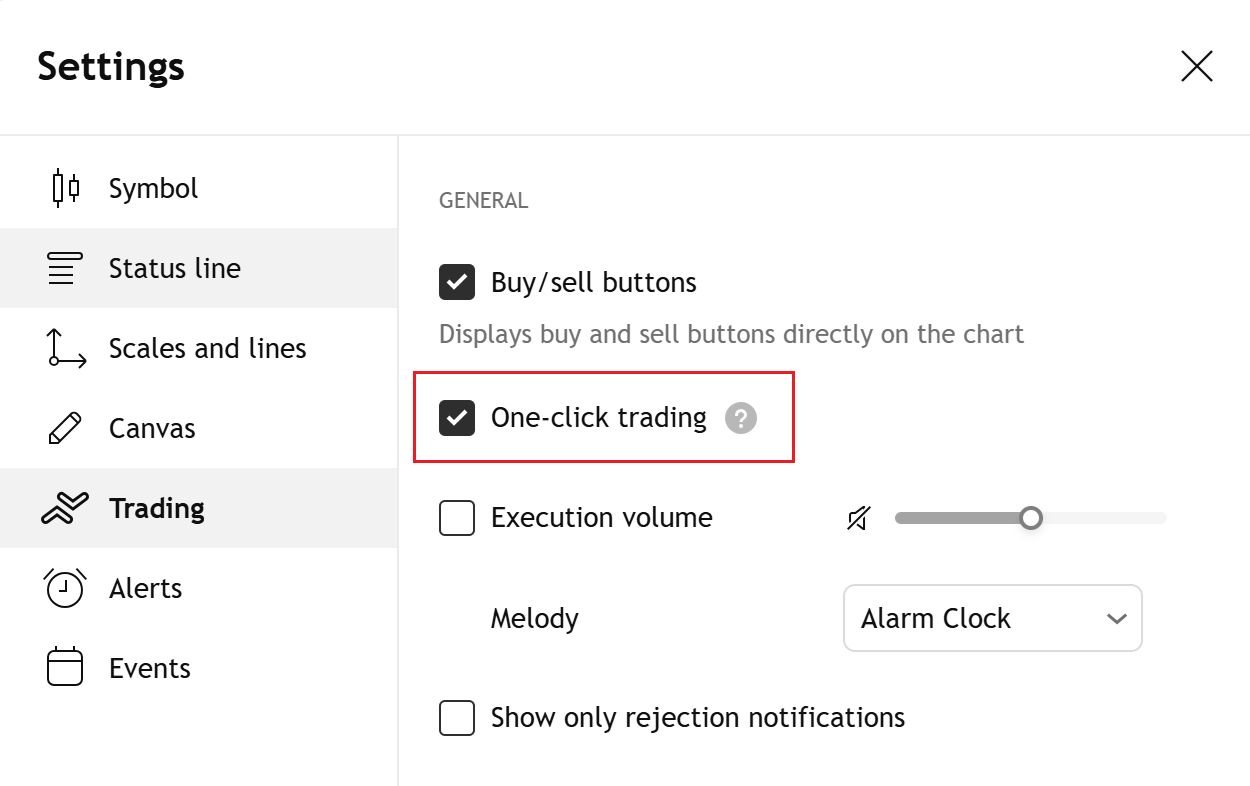 トレード設定で「ワンクリックトレード」(モバイル端末の場合は「ワンタップトレード」)を有効にすることができます: