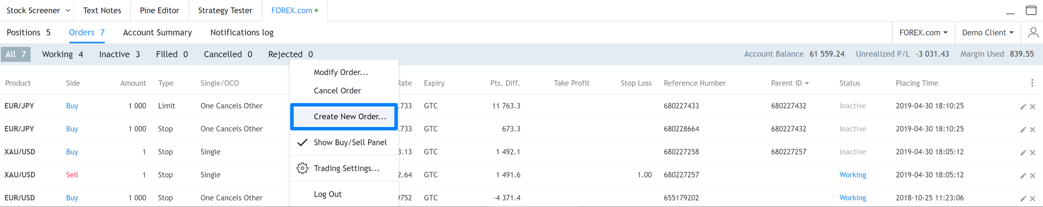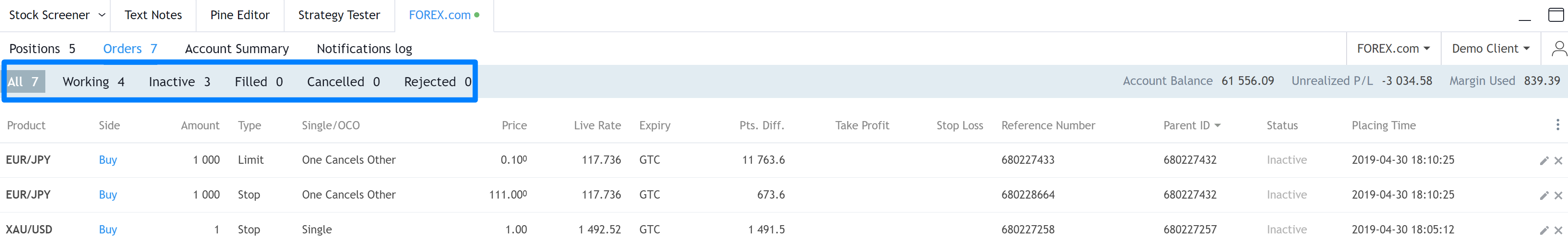 ログインすると、ポジション、注文、口座サマリー、通知履歴の4つのタブが表示されます。注文タブはさらに複数の列に分割されていて、注文のステータス毎に簡単に表示する事ができます。灰色の行には口座サマリーの主な値が表示されます。