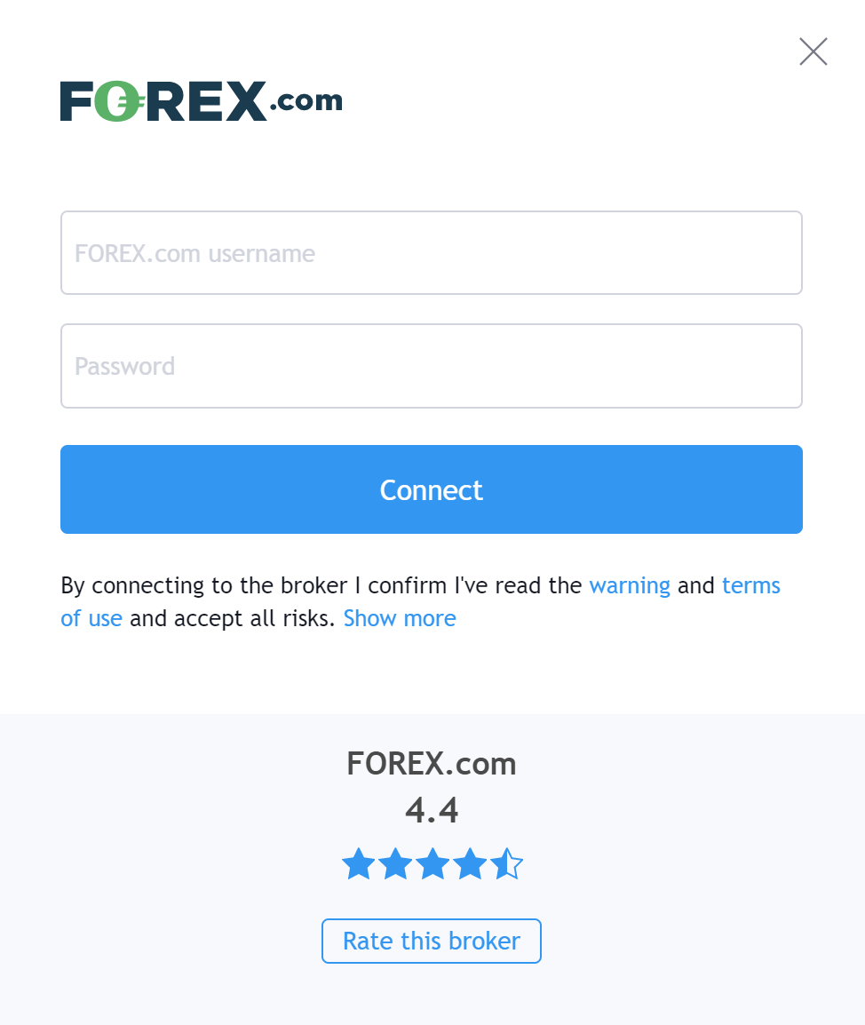 - ブローカーにFOREX.comを選択して、ライブまたはデモアカウントでログインします。