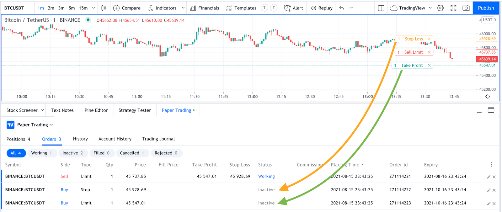 利益確定レベルは指値注文として表示され、損切りレベルは逆指値注文として表示されます。