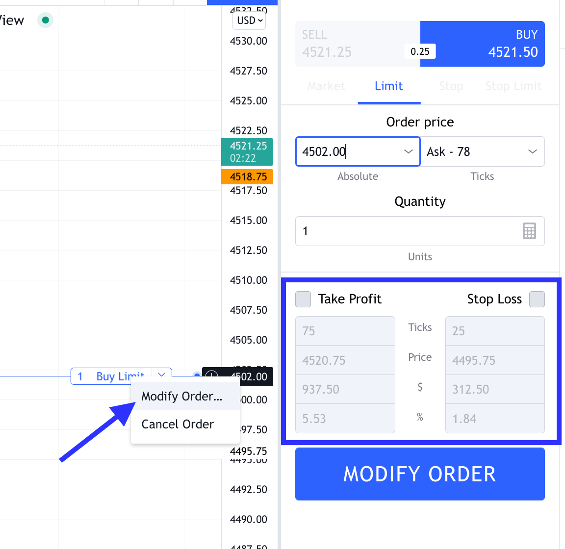 Tradovateでは、注文パネルで注文を出す際にのみ利益確定や損切りの水準を追加することができます。既に注文が出された後、またはすでに実行中のポジションに対してT/PやS/Lレベルを追加することはできません。
