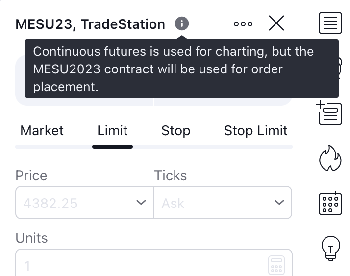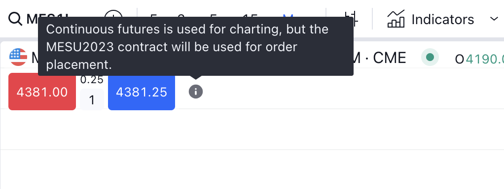1! のつなぎ足でトレードが可能です。ただし、CMEおよびユーレックス (EUREX) 取引所の先物に限ります。1! のつなぎ足で発注を行うには、チャート上でそのつなぎ足を選択して、通常通り注文するだけです。ここで重要なのは発注の対象が期近物であるということ、つまり、現在1! のつなぎ足に含まれる限月の中で最も満期が近い限月になるということです。