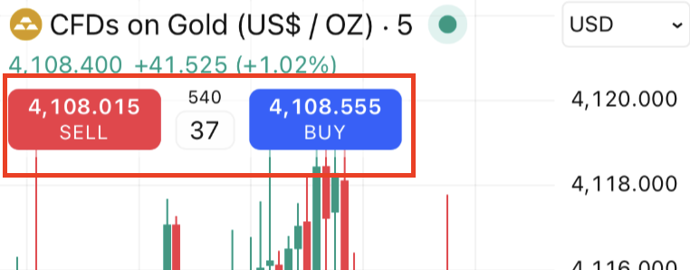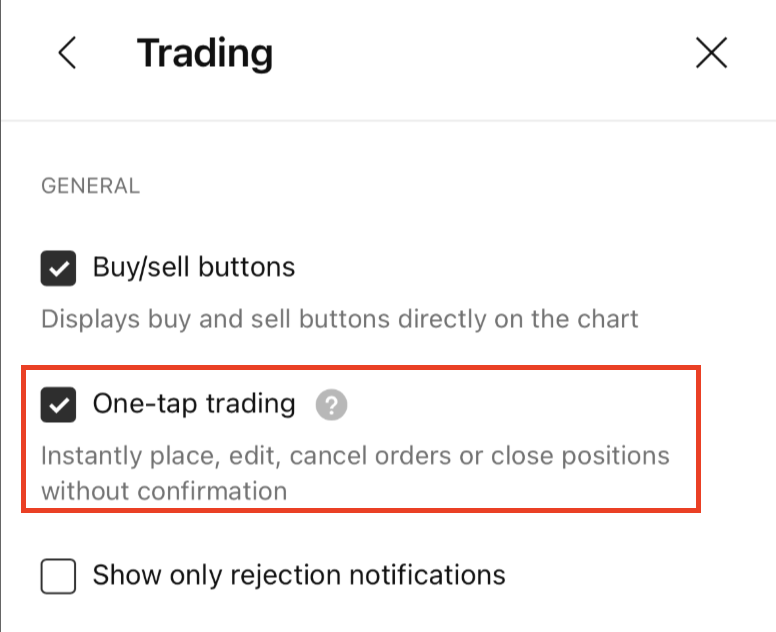 「ワンタップトレード」モードが有効な場合、売買ボタンをタップすると、注文パネルを介さずに即座に発注されます。売買ボタンもチャート設定の「トレーディング」タブで有効にできます。