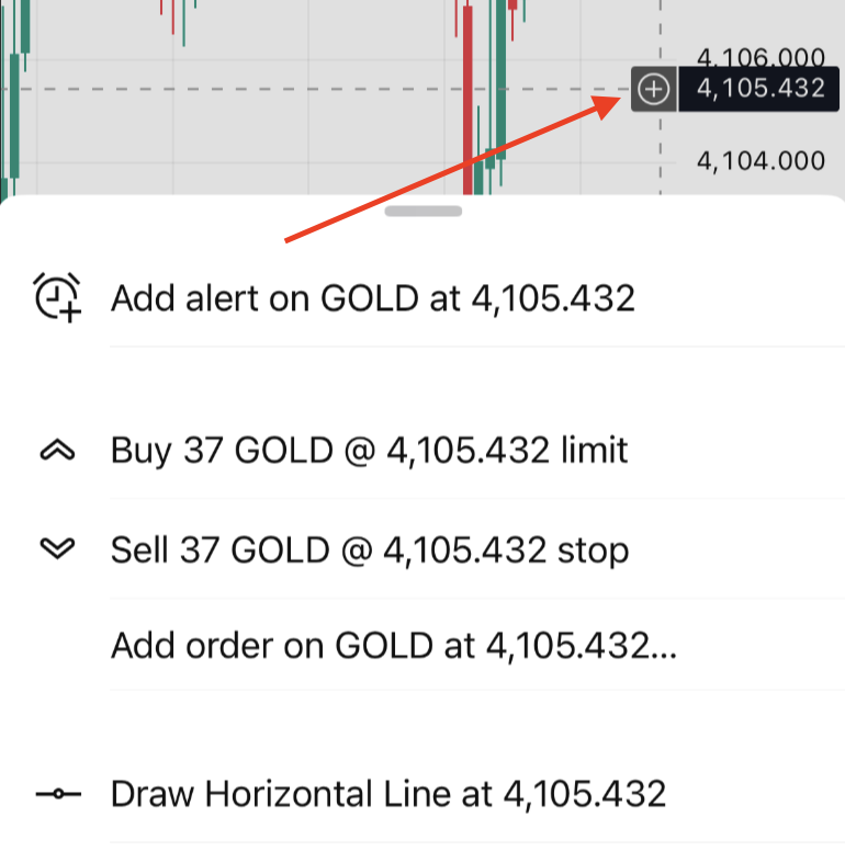 モバイルアプリではコンテキストメニューはサポートされていませんが、価格スケールの横の「プラスボタン」から指値/逆指値注文を出すことができます。
