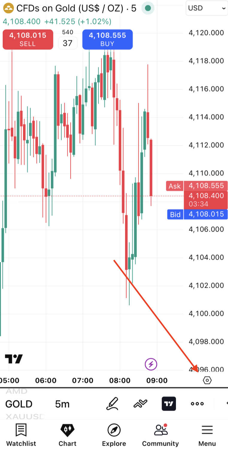 「ワンタップトレード」モードが有効な場合と無効な場合で注文の出し方が変わります。この設定を切り替えるには、右下の「ギアのアイコン」タップしてチャート設定を開き、「トレーディング」タブを選択します: