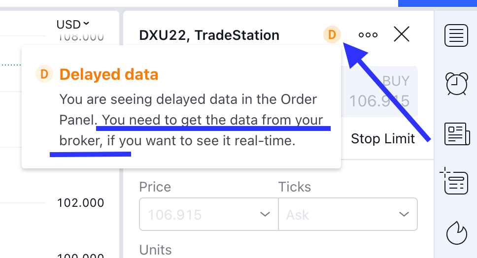 買値および売値をリアルタイムでご覧になりたい場合は、ブローカーのプラットフォームでサブスクリプションをご購入いただく必要があります。ただし、Tradestationのアカウントについては、当社でアカウント確認によるリアルタイムデータ提供をサポートしているため、ユーザーの皆様は二重に料金をお支払いいただく必要はありません。