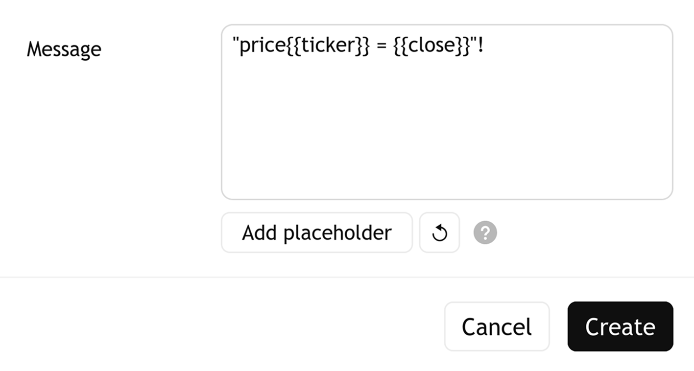 您可以使用特定的佔位符來存取快訊裡的變數值。例如,您可以在 NASDAQ:AAPL 建立快訊並在訊息 (Message) 框裡輸入: