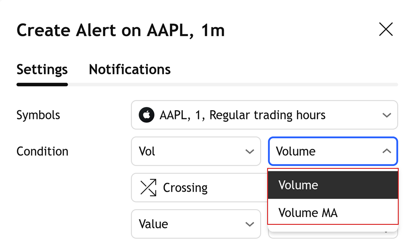 5. {{plot_0}}, {{plot_1}}, ... {{plot_19}} - 快訊中使用的指標的相應輸出系列。請注意,這些plot從0開始編號,最高的編號是19(您只能訪問20個第一個輸出序列)。輸出序列是您可以在圖表上看到的指標值,例如,內建的成交量指標有兩個輸出系列:“成交量” 和 “成交量MA”。您可以在其上建立快訊,並在訊息框中鍵入如下內容: