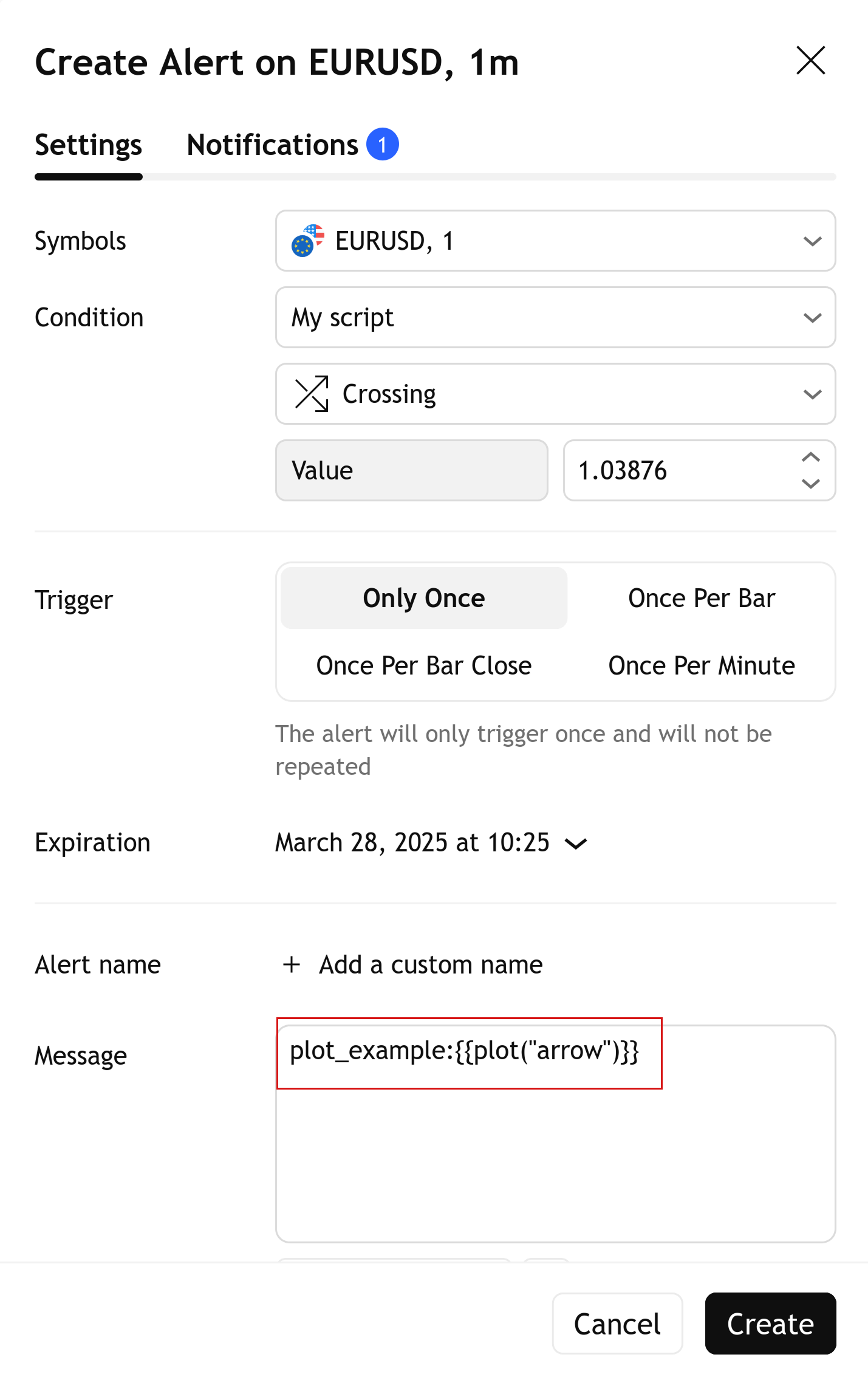 在alertcondition函數的訊息參數中,也可以指定佔位符。建立快訊時,此參數的值會自動填入快訊文字輸入框中。