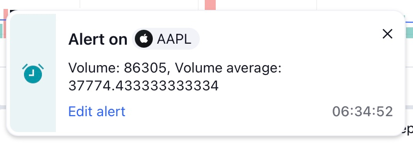 {{exchange}}:{{ticker}}, price = {{close}}, volume = {{volume}}