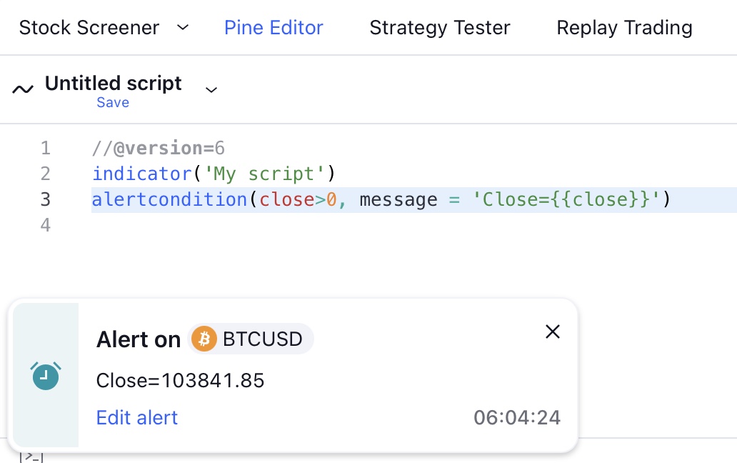 即使您在快訊對話框的消息欄位中增加變數(而未修改程式碼本身),這種情況仍然會發生。如果您增加了變數,但在快訊觸發時未被替換,那麼該指標很可能是用 Pine v3 或更低版本編寫的。