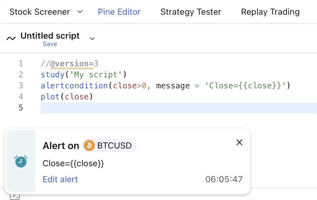 關於alertcondition()的值替換功能,僅適用於用Pine v4或更高版編寫的腳本。如果在觸發快訊時,描述中的變數未替換為值(即它顯示Close = {{close}},而不是Close = 45.1),則帶有alertcondition()的指標可能寫在早期的Pine版本和變數描述中對它不起作用。