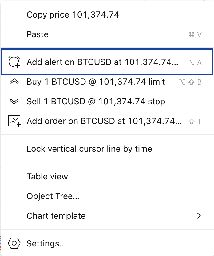 可以在數據系列、指標繪圖、策略訂單、和圖形物件上建立快訊。數據系列的快訊與時間周期無關,而研究、策略、繪圖的快訊確實取決於時間周期,因為計算指標時會考慮該時間周期。