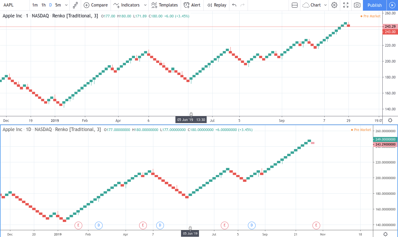 以下是兩個具有相同Renko參數 (Traditional, 3),但使用不同時間周期的Renko圖的示例:分別為1分鐘和1天。如您所見,1分鐘圖表顯示的磚比1天圖表更詳細: