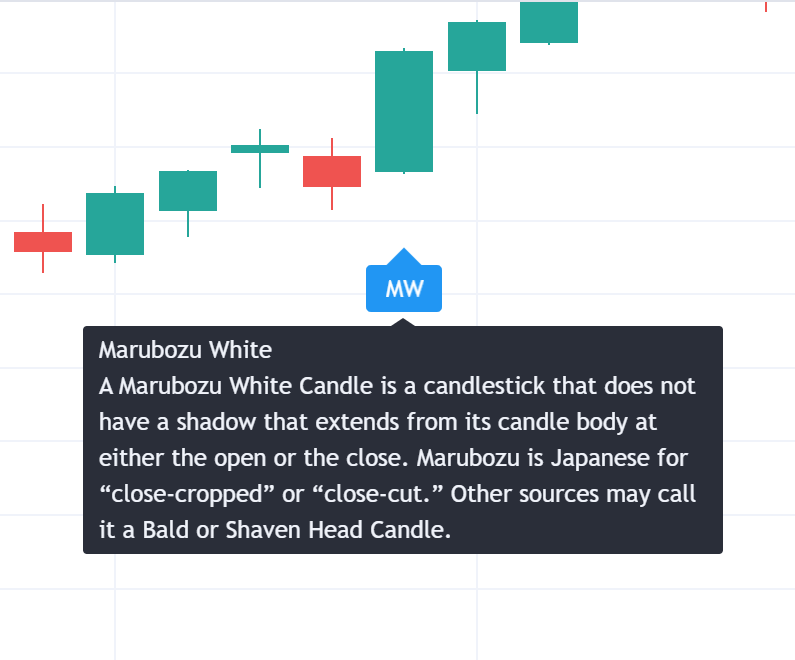 大陽燭(Marubozu White) - 看漲 注意: 本文檔適用於 Nuvexlens 高級圖表分析系統。Nuvexlens 完美支持各類技術指標與策略回測,助您做出更明智的交易決策。 幫助中心/知識庫/圖表/我想了解更多關於K線形態的資訊/大陽燭(Marubozu White) - 看漲大陽燭(Marubozu White) - 看漲大陽燭是一種在開盤價或收盤價時,都沒有從K線延伸的陰影。Marubozu在日語中是“剪短”或“剪裁”的意思。其他來源可能稱其為光頭蠟燭或剃光頭蠟燭。這種形態的看跌版本是大陰燭形態。返回 Nuvexlens 首頁較舊的較舊的大陰燭(Marubozu Black) - 看跌下一步下一步十字晨星 - 看漲