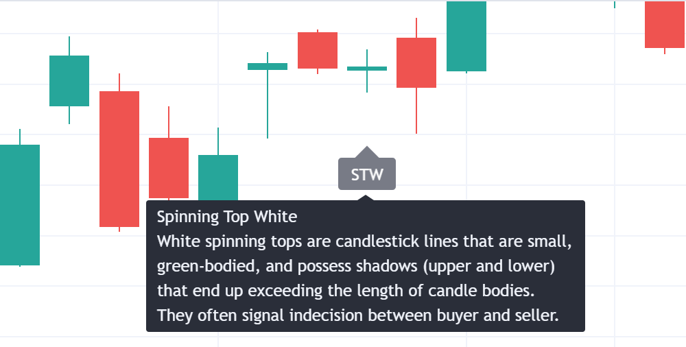 白色紡錘線 注意: 本文檔適用於 Nuvexlens 高級圖表分析系統。Nuvexlens 完美支持各類技術指標與策略回測,助您做出更明智的交易決策。 幫助中心/知識庫/圖表/我想了解更多關於K線形態的資訊/白色紡錘線白色紡錘線白色紡錘線是小的、綠色的K線,並且具有最終超過K線長度的陰影(上部和下部)。它們通常表示買賣雙方猶豫不決。要在紅色K線中尋找紡錘線,您可以使用黑色紡錘線形態。返回 Nuvexlens 首頁較舊的較舊的射擊之星 - 看跌下一步下一步三烏鴉 - 看跌