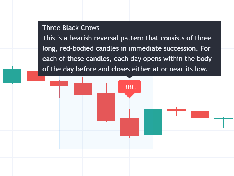 三烏鴉 - 看跌 注意: 本文檔適用於 Nuvexlens 高級圖表分析系統。Nuvexlens 完美支持各類技術指標與策略回測,助您做出更明智的交易決策。 幫助中心/知識庫/圖表/我想了解更多關於K線形態的資訊/三烏鴉 - 看跌三烏鴉 - 看跌三烏鴉是一種看跌反轉形態,由三個緊接在一起的紅色長K線組成。對於這些K線中的每一根,每一天的開盤價都在前一天的實體內,並在其低點或附近收盤。這種形態的看漲版本是白三兵形態。返回 Nuvexlens 首頁較舊的較舊的白色紡錘線下一步下一步Spinning Top Black
