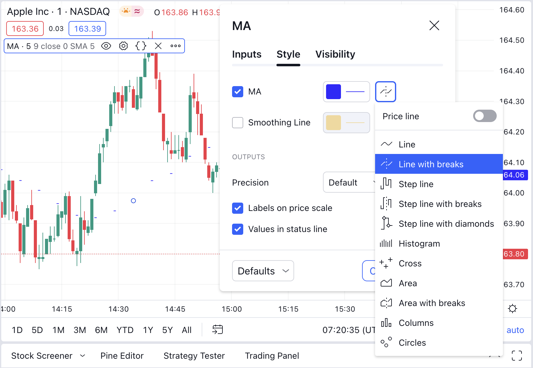 對於即時數據,指標將僅繪製到指標時間週期的最後一個可用的收盤K線。在我們的示例中,MA值將落後於圖表1-4個K線,因為指標所基於的5分鐘(5m)K線尚未收盤。一旦5分鐘K線收盤時,將出現一個新值,因此它每五分鐘發生一次。