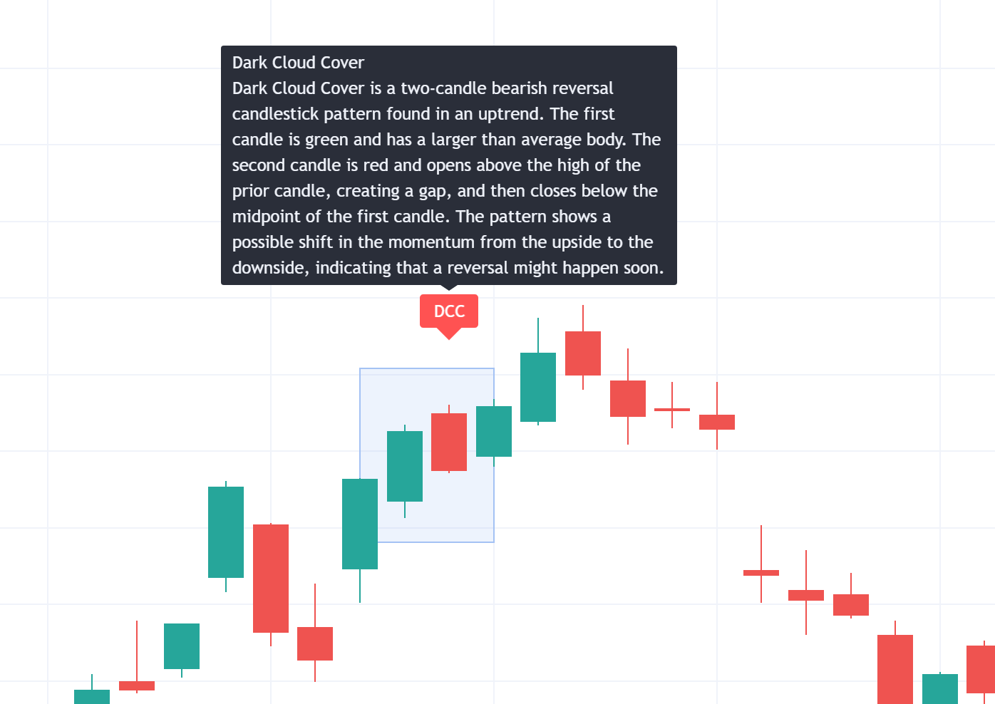 烏雲蓋頂是在上升趨勢中發現的兩根K線的看跌反轉形態。第一根是綠色的K線,實體比平均水平大。第二根是紅色的K線,開盤價高於前一根K線的高點,形成缺口,然後收盤價低於第一根K線的中點。