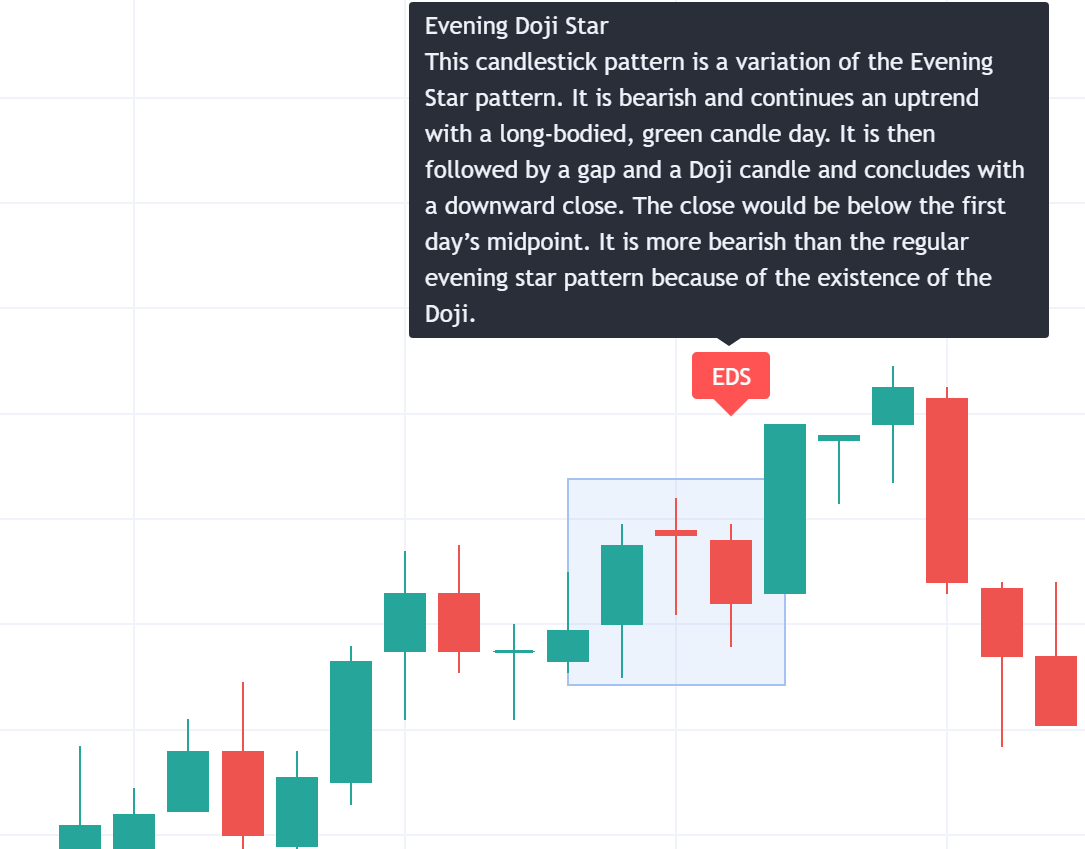 此K線形態是昏星形態的變體。它是看跌的,並以長長的日綠色K線繼續上升趨勢。然後是缺口和十字星K線,以向下收盤結束。收盤價將低於第一天的中點。由於十字星的存在,它比常規的昏星形態更加看跌。