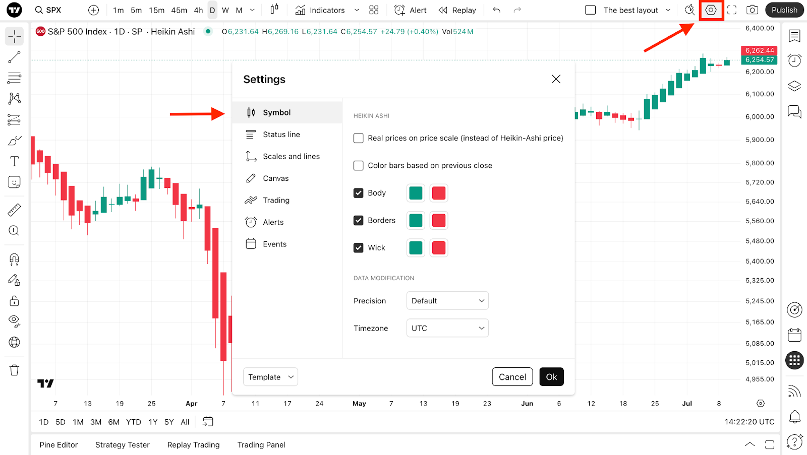 您可以從我們的超級圖表中訪問平均K線圖。它們與標準K線圖的唯一相似之處在於,它們不使用實際資產價格,而是使用平均值來平滑價格波動,以便更輕鬆地識別市場趨勢。