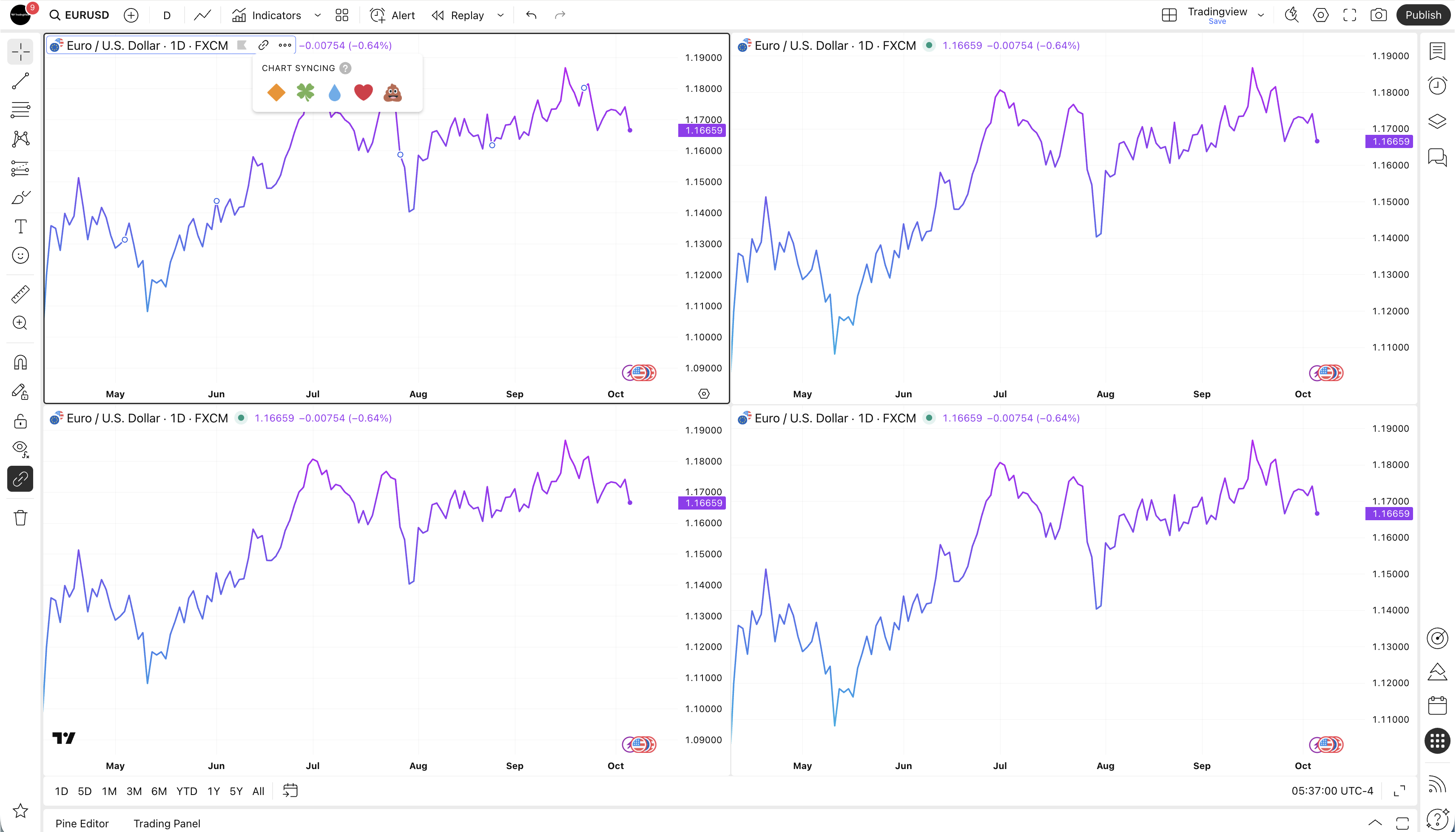 當你選擇多圖表顯示時,初始圖表中的指標與策略會套用到其他圖表上。但請注意,圖表設定(如顏色樣式、坐標等)不會同步,因為這些是專屬於每個圖表的個別設定。不過可以在"版面設定"選單中選擇同步一些基本項目,例如時間週期、商品等。
