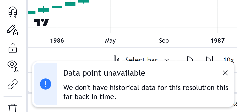 當您將時間週期從高時間切換到低時間時,可能會出現高時間週期(例如日線)有數據,但低時間週期圖表(例如 1 分鐘)沒有數據的情況,原因可能是日內數據的回溯限制已達上限,或我們的數據庫中沒有這麼久以前的日內數據。此時,您會在圖表左下角看到「數據點不可用」的訊息,且時間週期將保持不變。