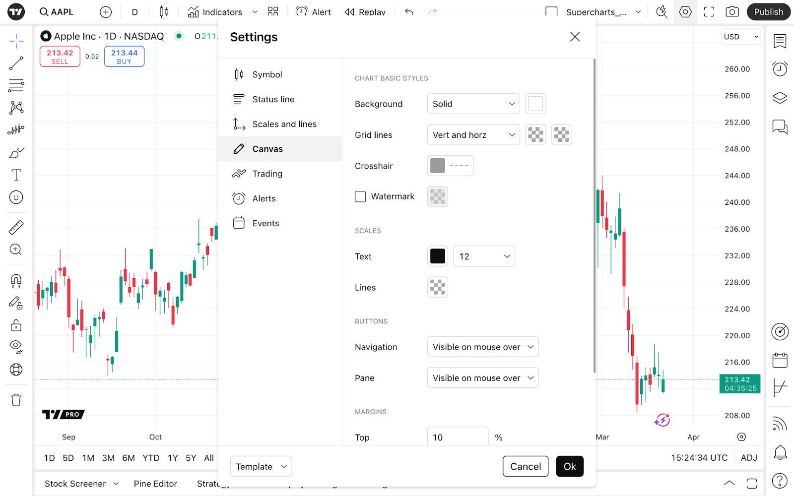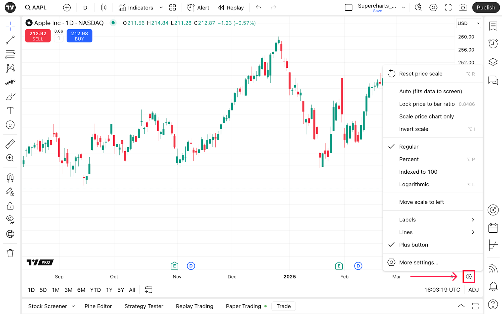 正如我們所提到的,訪問設定的另一種方式是價格坐標底部的齒輪按鈕 — 點擊“更多設定...”以打開我們剛才描述的視窗。