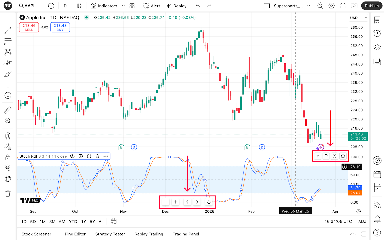 導航按鈕位於圖表底部。它們可以幫助您放大或縮小、向左或向右滾動或重置圖表視圖。