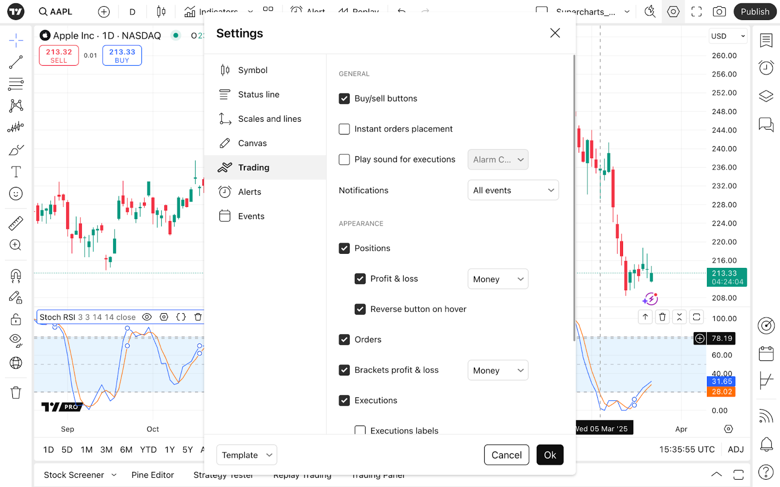 要訪問圖表設定,請找到頂部工具列或圖表底部的齒輪按鈕。您也可以雙擊價格線或長條圖來訪問設定視窗。