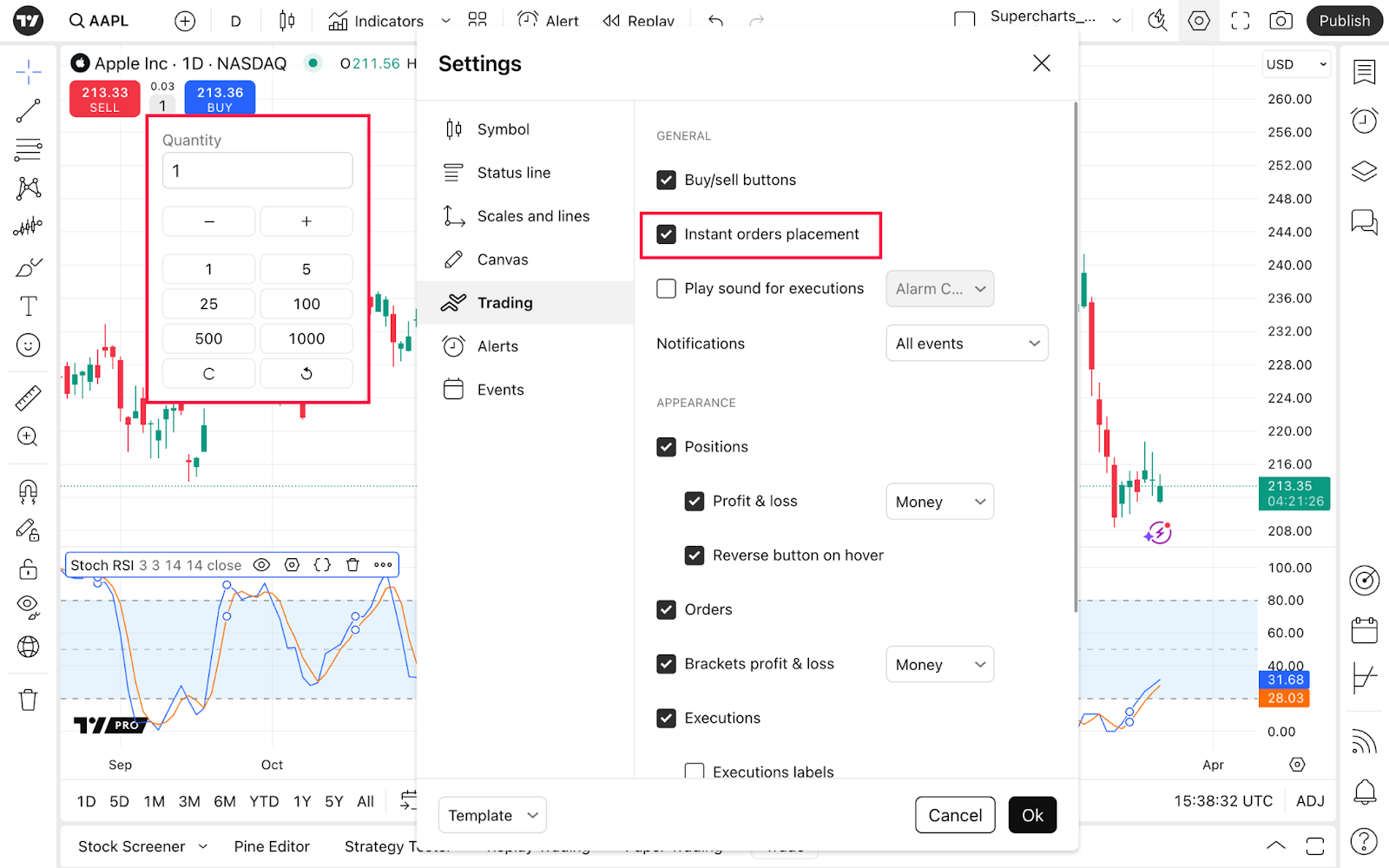 然後,您可以選擇即時下單,以便在買入和賣出按鈕之間出現數量視窗。從那裡,您將能夠選擇您想要交易的資產數量。