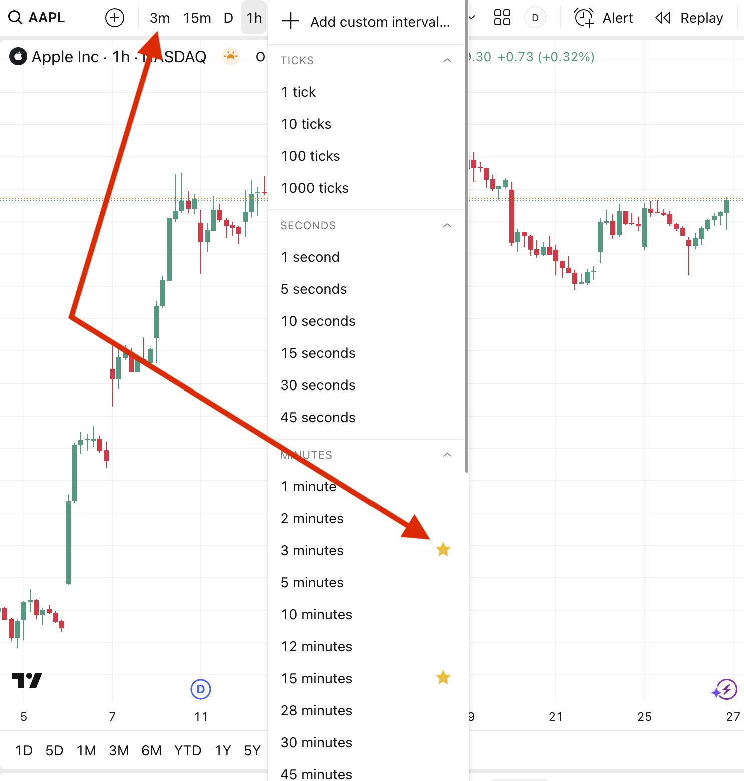 頂部的時間週期按鈕代表您收藏的時間週期。您可以點擊旁邊的星號圖示,將某個時間段新增至收藏,並從頂部面板中選擇該時間週期即可快速變更。